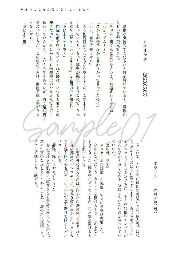 2024/3/17 HARU COMIC CITY 32内 横皆中の音6にて発行した湊静WEB再録本『みらいでならんだせかいはいとしい』サンプル
